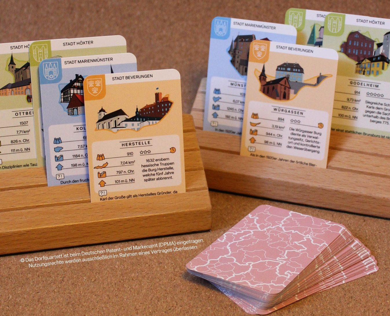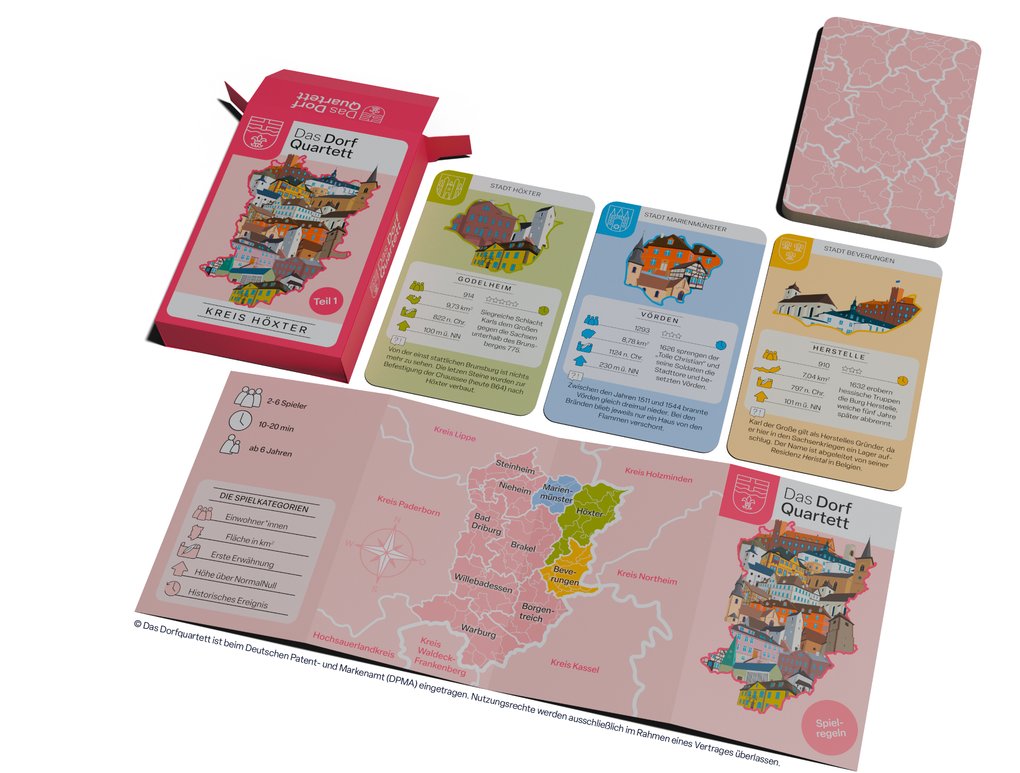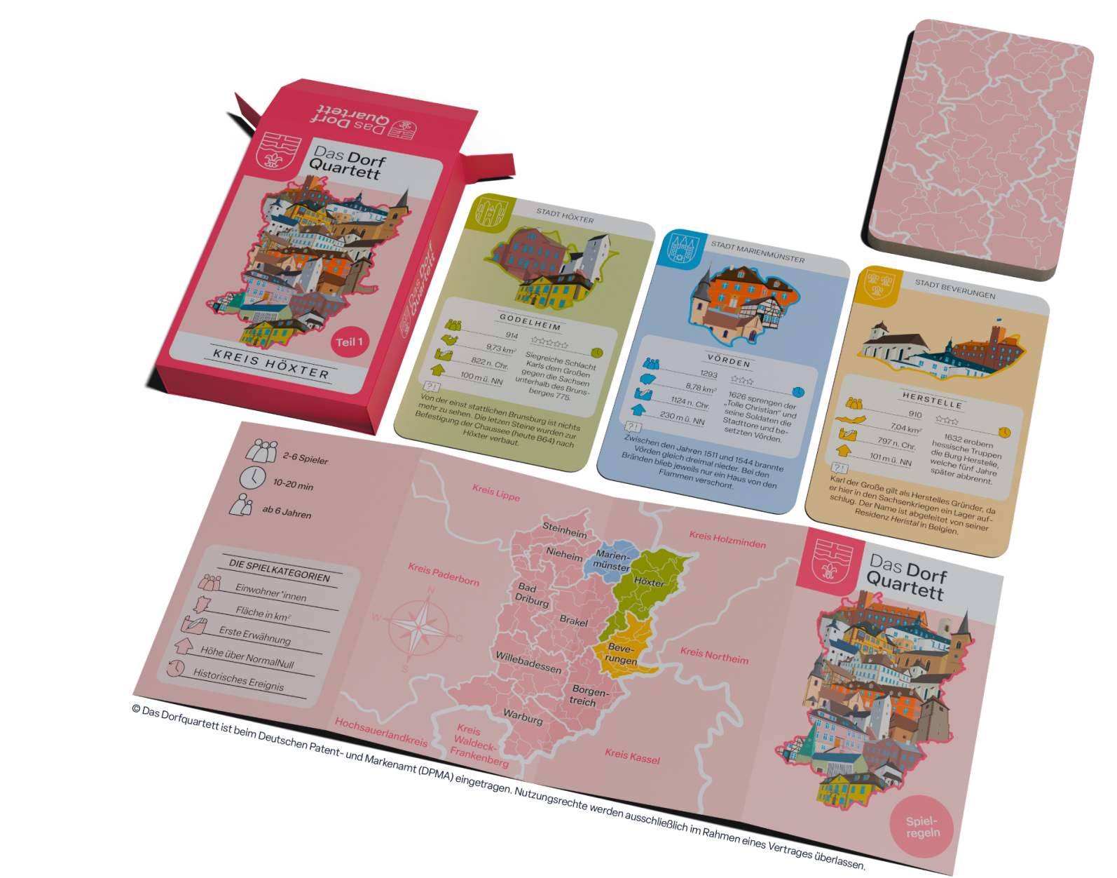 Das Dorfquartett nimmt dich mit auf Entdeckungsreise durch die Dörfer deiner Region. Lerne deine Heimat von historischen Ereignissen über charakteristische Gebäude bis zu den geographischen Fakten spielerisch kennen: Wer hat die meisten Bushaltestellen? Wo steht kein einziges Windrad? Und welches Dorf hat die wenigsten Einwohner?