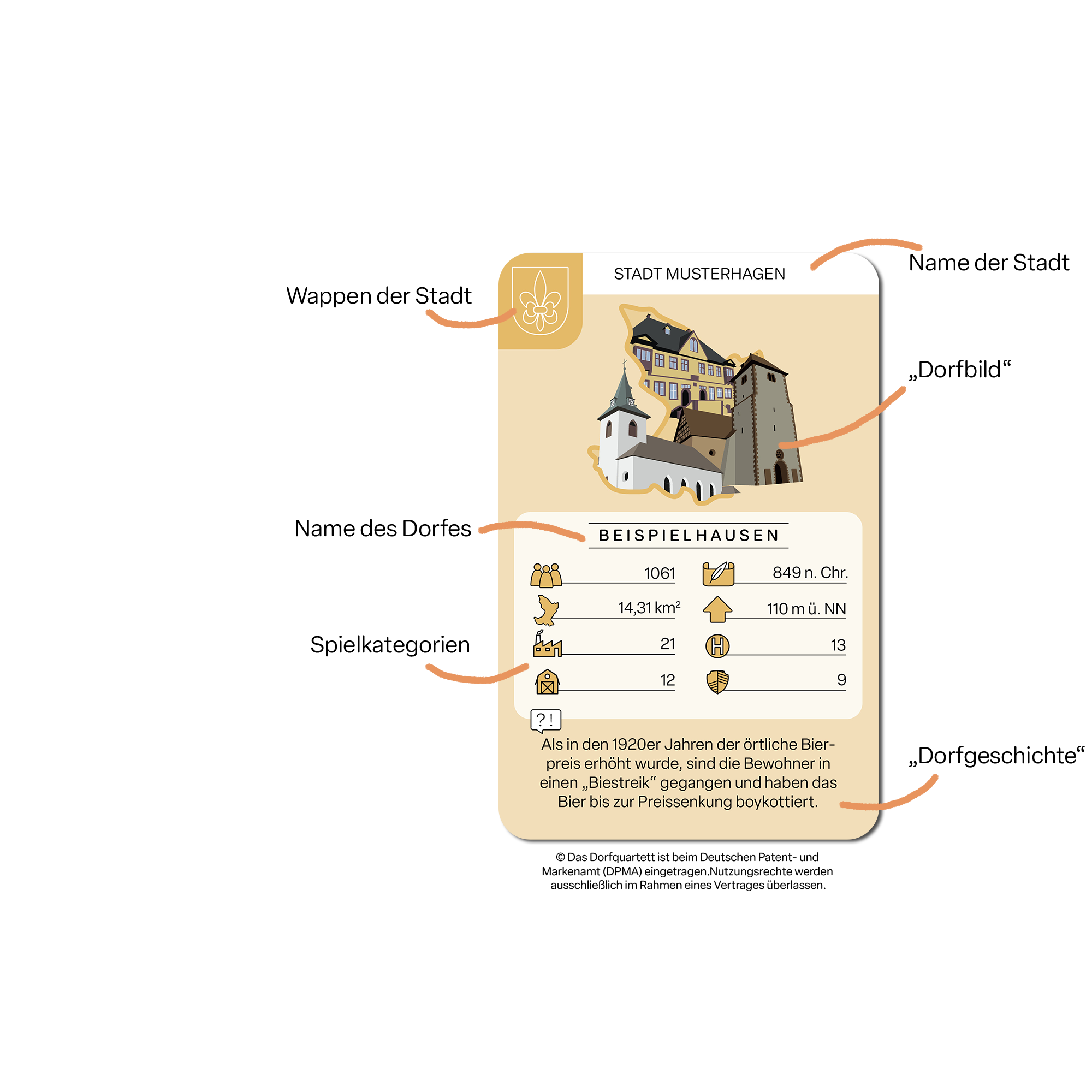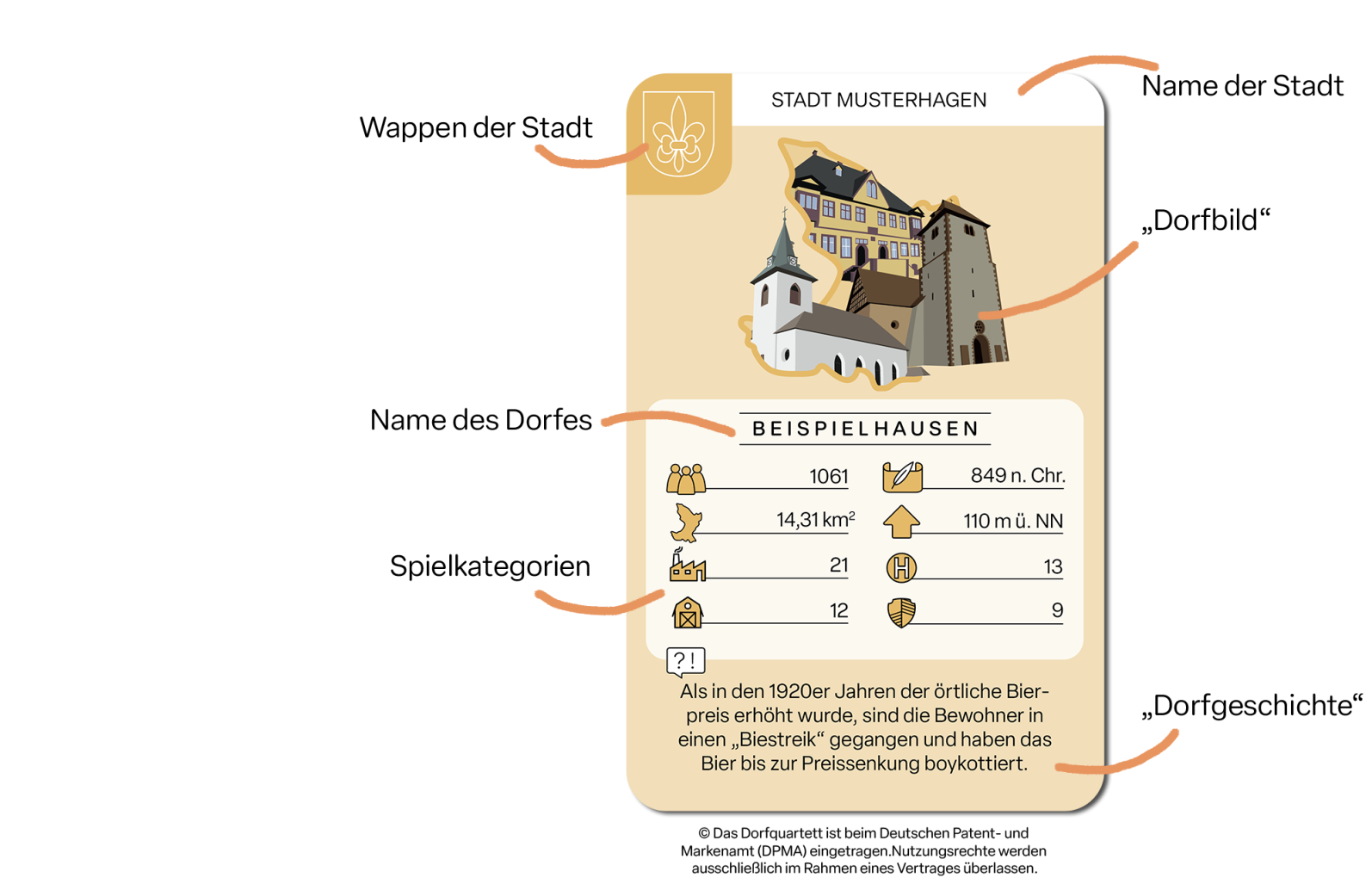 Die Dörfer legen einen Spielkarten-Standard festgelegt. Das "Dorfbild" kann aus bis zu 3 Motiven bestehen und 8 Spielkategorien passen gut auf die Karte.